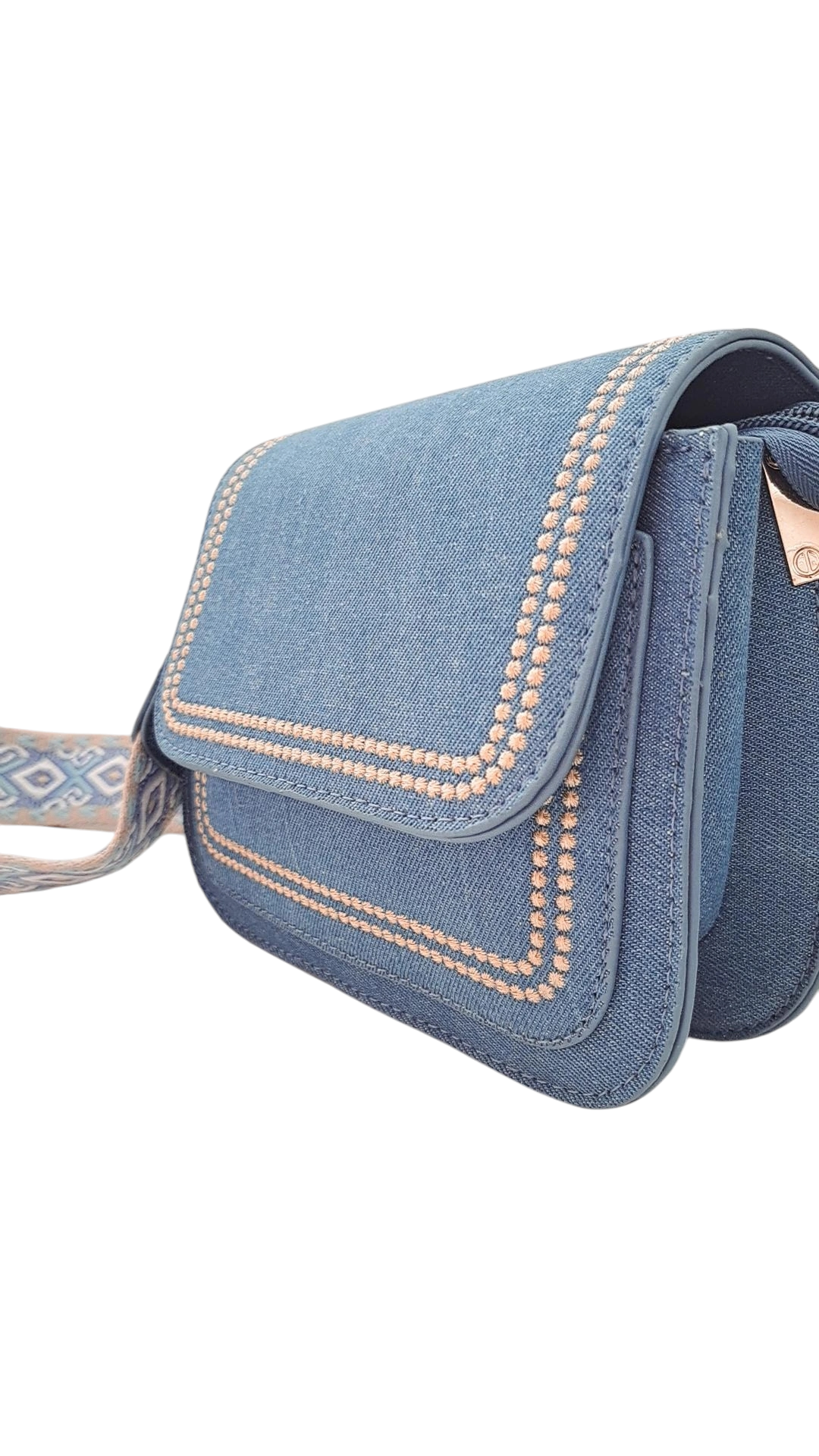 Mooi denim blauwe schoudertas met verstelbare en afneembare bagstrap
